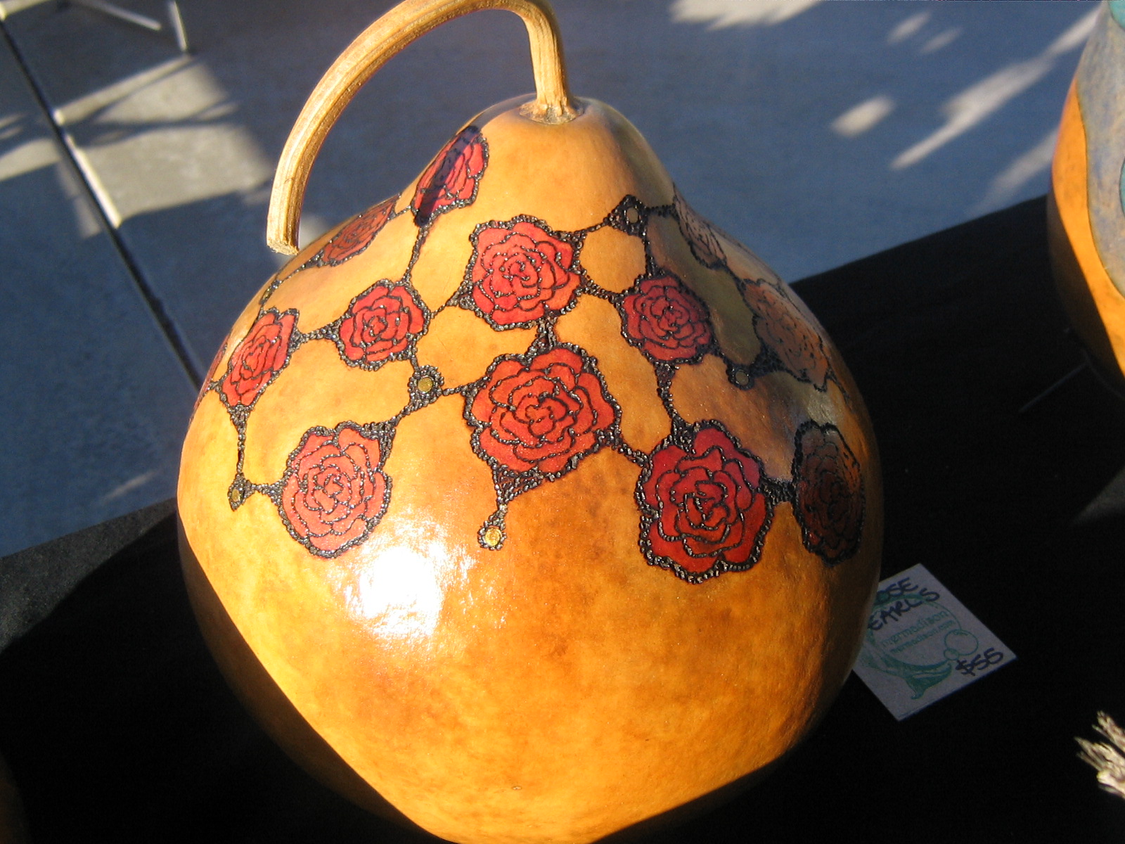 In the background, you can see there’s a gourd decorated with intricate feather designs. It’s amazing that anyone could draw something this detailed on paper, let alone convey their vision to a round object. Madison has a few more incredible looking creations like her apple and cameo gourds and the Koi designs. You can find them on Etsy or become a Facebook fan. There, Madison. Hope I made up for the alphabetical error.